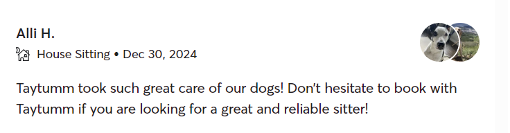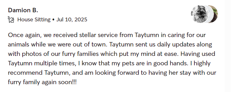 Safety and tailored attention are the foundations of my care. I manage every environment carefully to prevent risks and maintain a peaceful atmosphere for your dog. From sitting to neighborhood walks, I prioritize your pet’s security and happiness above all else.